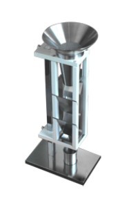 斯科特容量計法測試松裝密度是指把粉末放入上部組合漏斗中的篩網上,自然或靠外力流入布料箱,交替經過布料箱中的四塊傾斜角為25°的玻璃板和方形漏斗,最后流入已知體積的圓柱杯中,呈松散狀態。然后稱量圓柱杯中的粉末的質量計算所得之密度值。