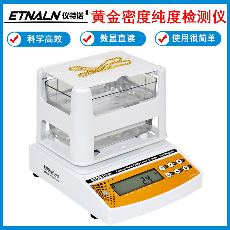 儀特諾黃金密度計_貴金屬純度檢測儀_黃金首飾檢驗真假的儀器ET-320K、ET-600K 、ET-1200K,無需捆綁測試樣品,僅兩個步驟:先測量空氣中重量,按ENTER鍵,再放入水中測水中重量,按ENTER鍵,即可準確、快速的顯示黃金K值、%含量、密度值;如果是測鉑金,即2步直接顯示鉑金PT值、%含量、密度值;或測銀就直接得出銀S值、%含量、密度值;也可以測量黃金或及其它合金的%含量、密度值。