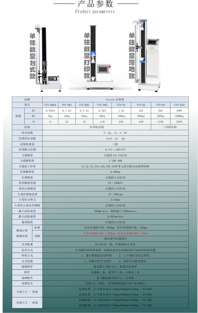 選購:無夾具試驗行程:1320mm;有夾具試驗行程:720mm;細(xì)分型號后綴帶H。